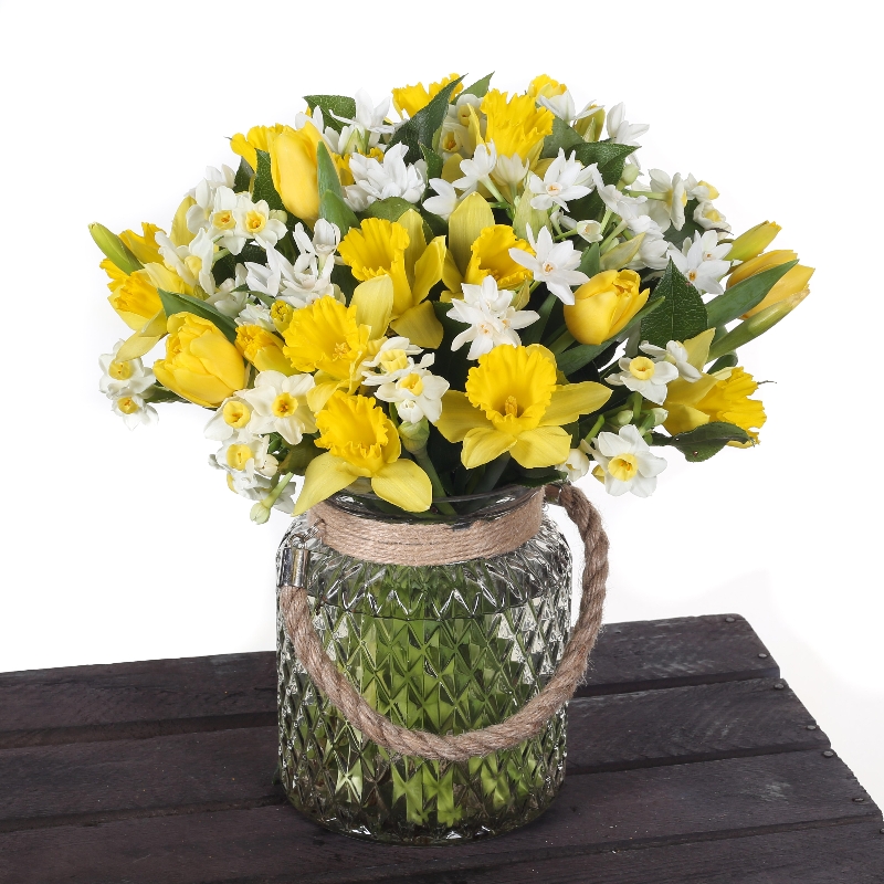 A beautiful scented vase arrangement of daffodils and narcissus. Please note vase may vary slightly